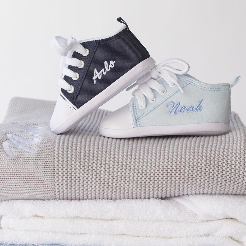 These adorable navy baby shoes add a classic and personalised touch to any little oneβs wardrobe, featuring soft materials, white laces and beautifully embroidered detailing. Perfect for everyday wear or gifting, the Personalised Navy Blue Baby Shoes offer both comfort and style in one sweet keepsake. Thoughtfully crafted and designed to cherish, they make a timeless addition to any newborn collection.
