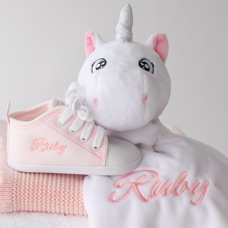 Our adorable Personalised Pink Baby Shoes are shown above with a cute Personalised Unicorn Baby Comforter that are personalised with the name Ruby. These items are embroidered with pink thread and using our alex brush font. The shoes and the unicorn are used in a variety of different gift sets or you can order both items with the same baby name and they’ll come packed in one large gift box.