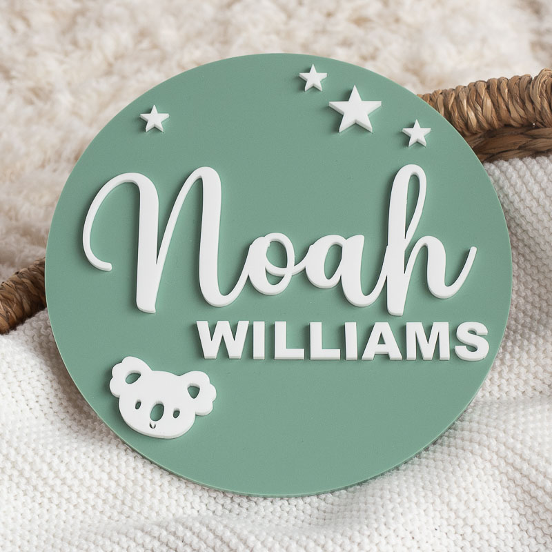 The Baby Birth Announcement Disc Koala & Stars provides a refined way to share your baby’s arrival and works beautifully for birth photos, keepsakes and nursery styling. Crafted from green acrylic, the Baby Birth Announcement Disc Koala & Stars features your baby’s name alongside a koala and stars made from white acrylic, creating a clean and well balanced finish. This personalised birth announcement disc suits new and expecting parents seeking a thoughtfully designed display piece to mark an important milestone.