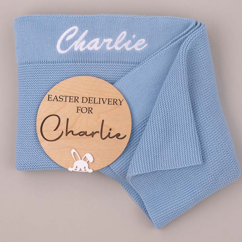 The Blue Knitted Blanket & Easter Disc Baby Gift with up to 12 characters. The blanket is embroidered across the top band in your choice of font and thread colour, while the wooden disc is customised with baby’s name as shown in the product images.