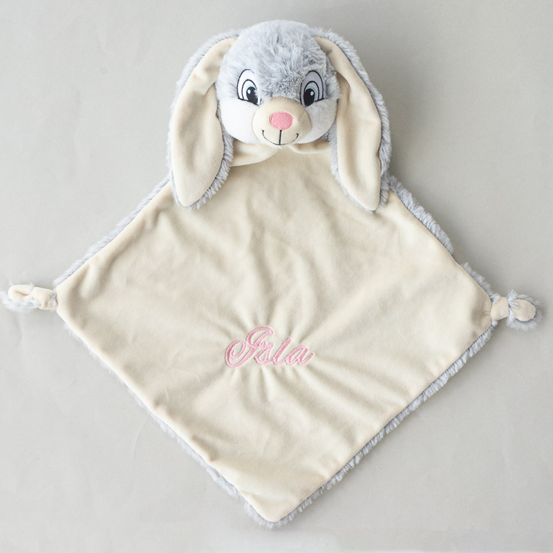 • Personalised Baby Comforter Grey Bunny embroidered with girls name Isla.